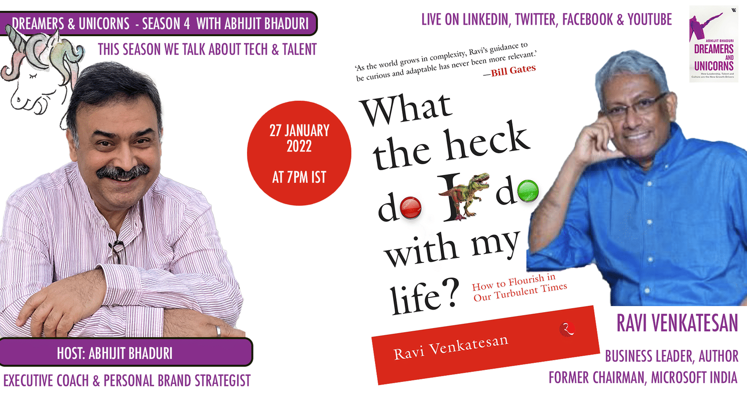 I will be chatting with Ravi Venkatesan on January 27, 2022 at 7pm IST. He will be the first guest of Season 4 of my weekly LinkedIn Live. The theme for season 4 is Technology and Talent. It will be a live chat where you can ask questions too. So join in.
