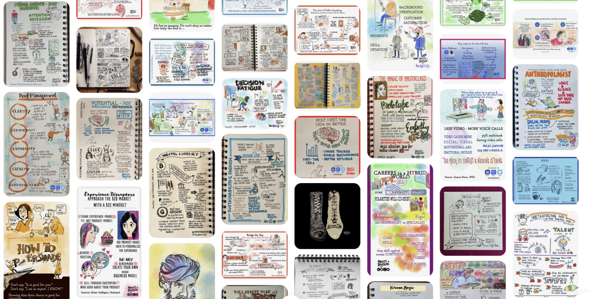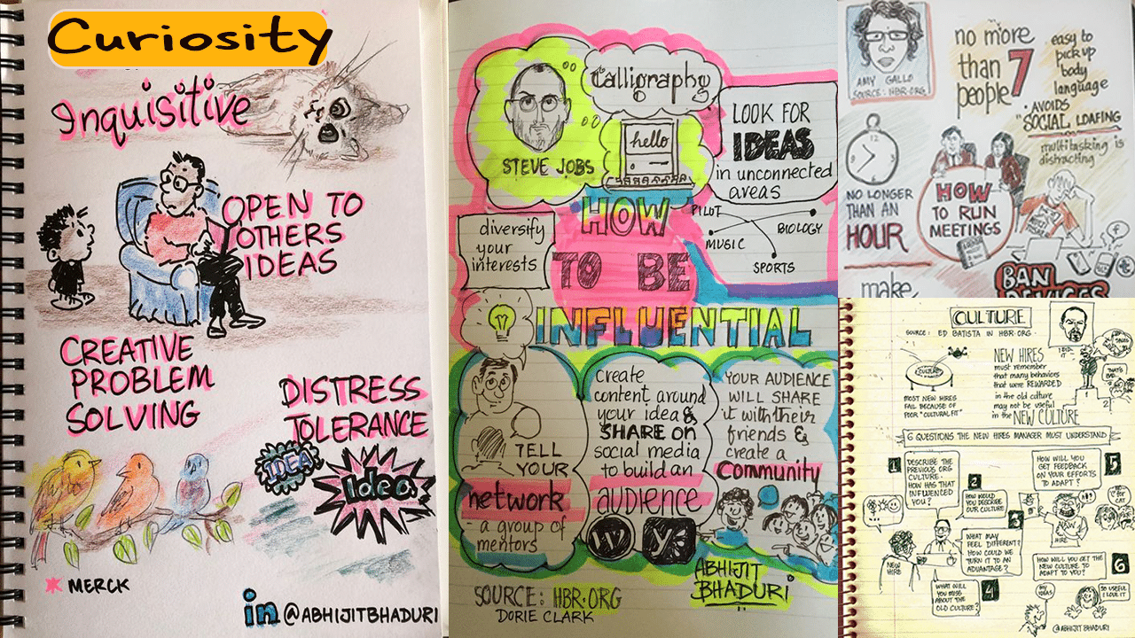 Sketchnotes is a wonderful way to make sense of what I read. That could mean summarising a book or a TED Talk or an article. When I left Wipro I started posting my Sketchnotes on LinkedIn and Twitter. My followers grew on LinkedIn from 3000 to 800,000. When Pinterest caught my fancy, I started a board around Sketchnotes <see the Pinterest board>