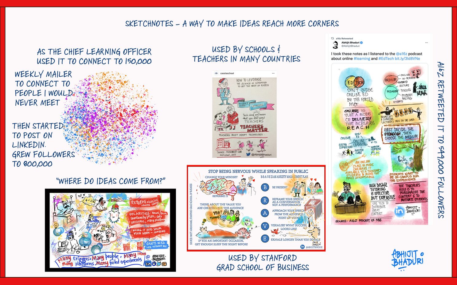 Prof Matt Abrahams the Graduate School of Business at Stanford shared another. Professor Bill Fischer, the Professor of Innovation at IMD Lausanne turned one of my sketchnotes into a poster and put it up outside his office. I share these sketchnotes as part of the Creative Commons license. Anyone can use it as part of their presentation or research or writing.