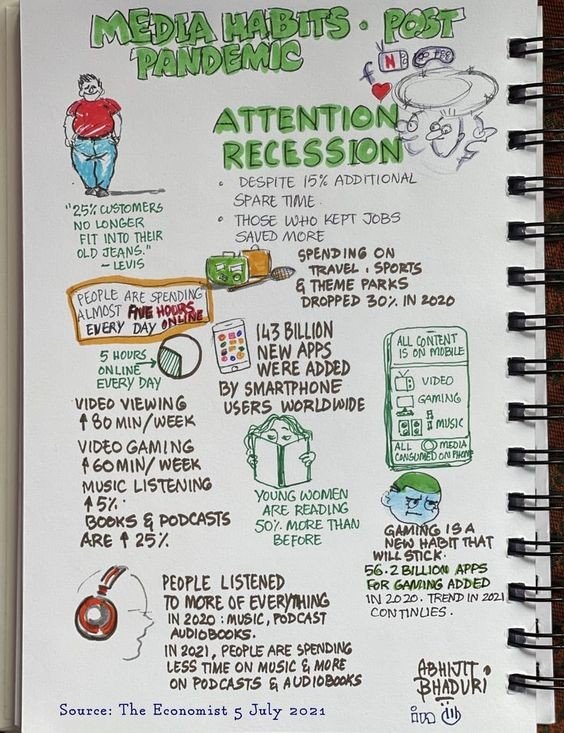 Engage Multiple Senses: Use visuals like diagrams, charts, or videos to supplement verbal explanations. Use hands-on activities, role-playing, or real-life applications to build fun into learning. Find out whether you learn better by reading, or watching videos or podcasts. The pandemic changed our media habits. I used an old sketchnote to summarize the changes.
