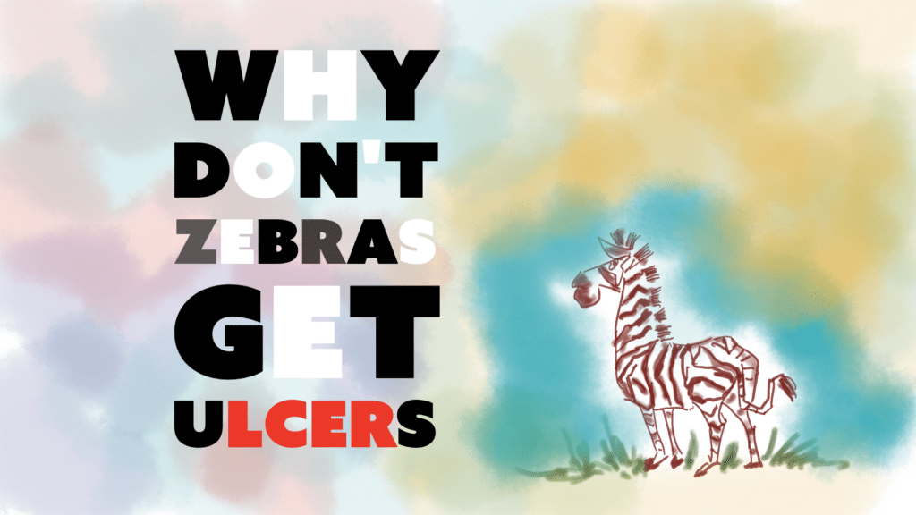 A cartoon zebra with thought bubbles, pondering why zebras don't get ulcers, a concept from the book review.
